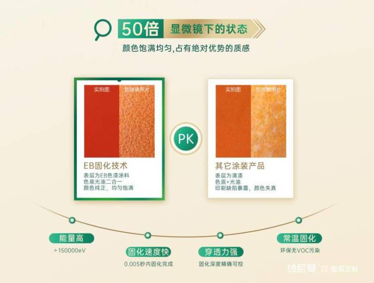领先的黑科技——EB电子束固化技术,穿透力强,0.005秒99%以上的深度固化率,使EB高能板拥有纯正饱满的色彩,无惧紫外线带来的老化、黄变、褪色等问题,色彩持久恒新,颜值持续在线。