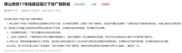 当时,就有不少人提出异议,如为何佛山11号线不能绕过住宅区,非要选择穿过中央公园?广钢段的线路建设计划,能不能取消等。