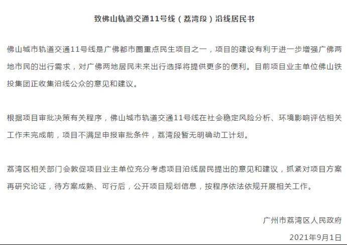 2021年9月,广州市荔湾区人民政府曾发布《致佛山轨道交通11号线(荔湾段)沿线居民书》,提及佛山城市轨道交通11号线在社会稳定风险分析、环境影响评估相关工作未完成前,项目不满足申报审批条件,荔湾段暂无明确动工计划。