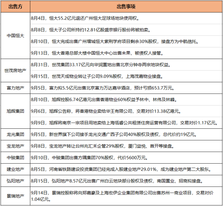 此外,9月前三周,除了上述房企外,还有宝龙、龙光、景瑞等多家房企出售资产,涉及出售金额较小。