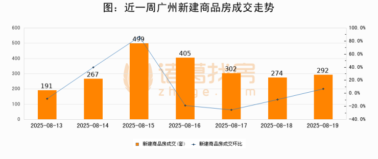 根据广州市住房和城乡建设局数据显示,2025年08月19日广州新建商品房成交292套,较昨日增加18套,环比上涨6.6%