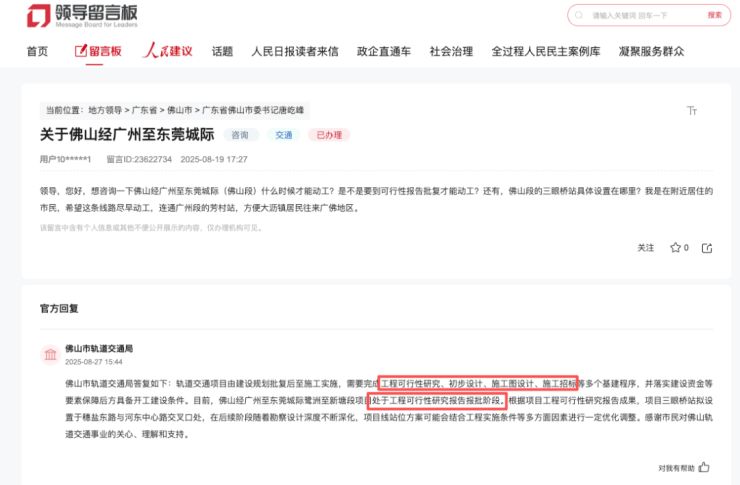 8月27日,佛山市轨道交通局答复如下: