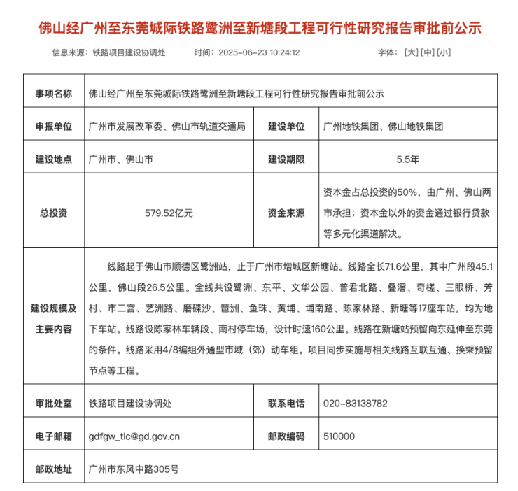 此前6月23日,广东省发改委发布《佛山经广州至东莞城际铁路鹭洲至新塘段工程可行性研究报告审批前公示》,总投资579.52亿元,建设年限5.5年。