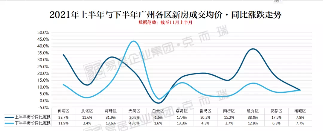 与其同时,克而瑞提取了2021年上半年与下半年的新房成交均价,与2020年同期作对比,发现:仅天河、白云两区例外,下半年新房成交均价同比涨幅比上半年的增多;其余9区的新房均价同比涨幅都在缩小。并且,越秀、黄埔以及海珠区的下半年同比涨幅下滑最为明显,分别较上半年的同比涨幅减少了25.1%、21.8%和18.4%。