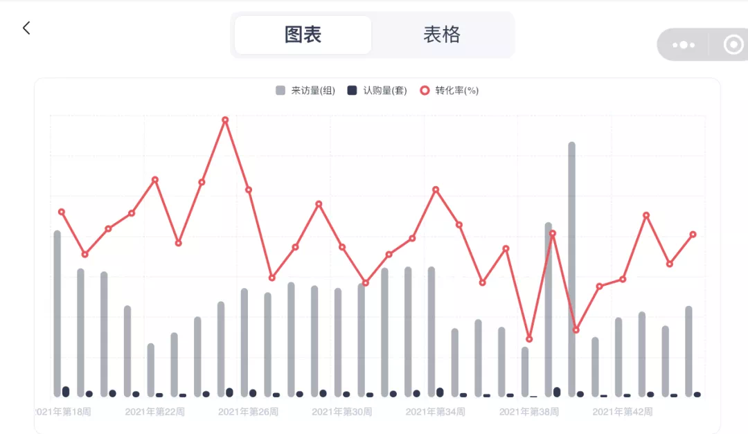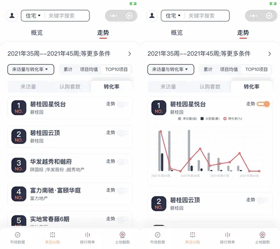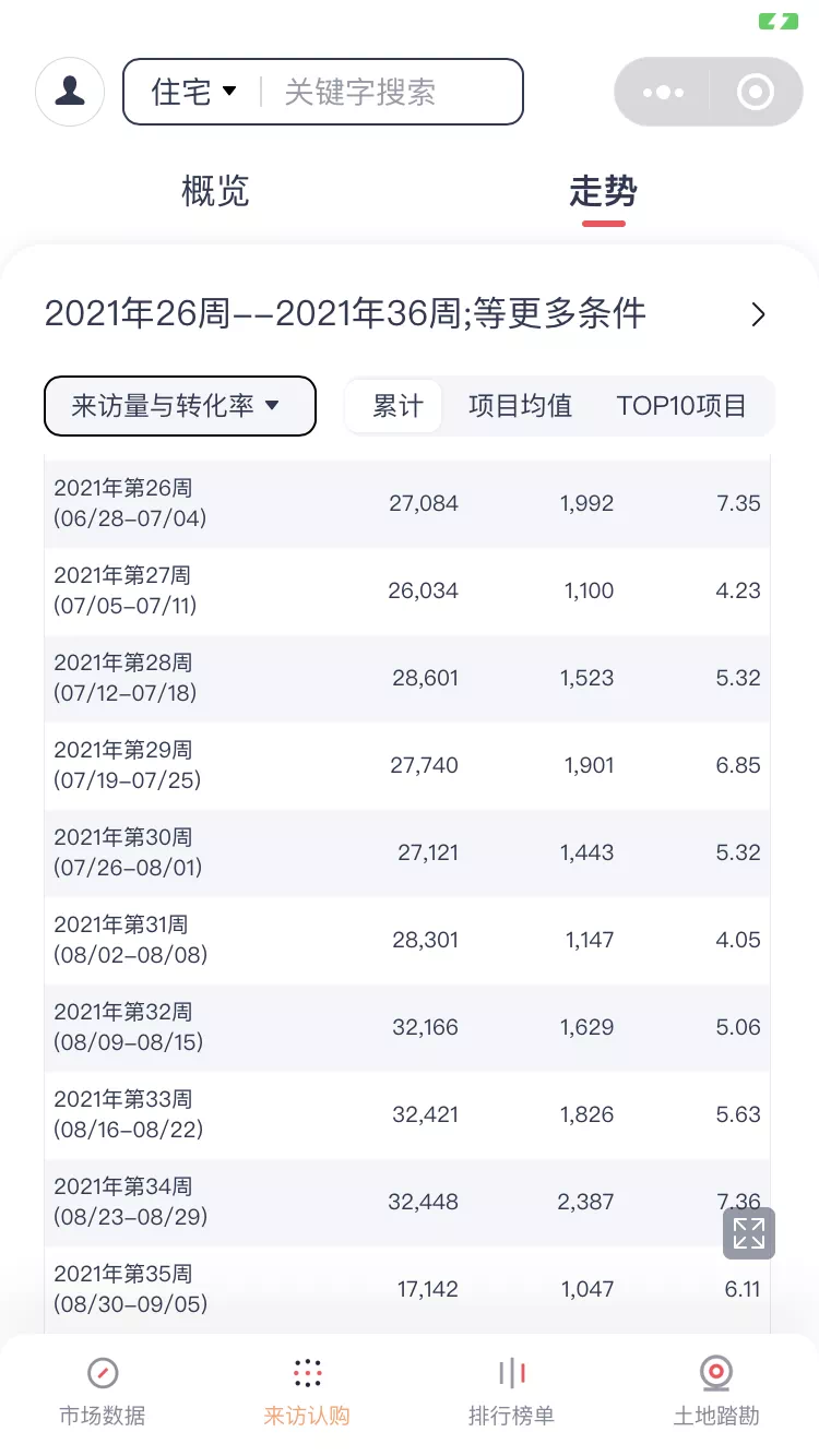 而排名来访/认购转化率TOP排名前列的碧桂园星悦台,也从第35周的新房来访/认购转化率44.4%跌至低谷;并且转化率前三项目也均是这样的走低趋势。