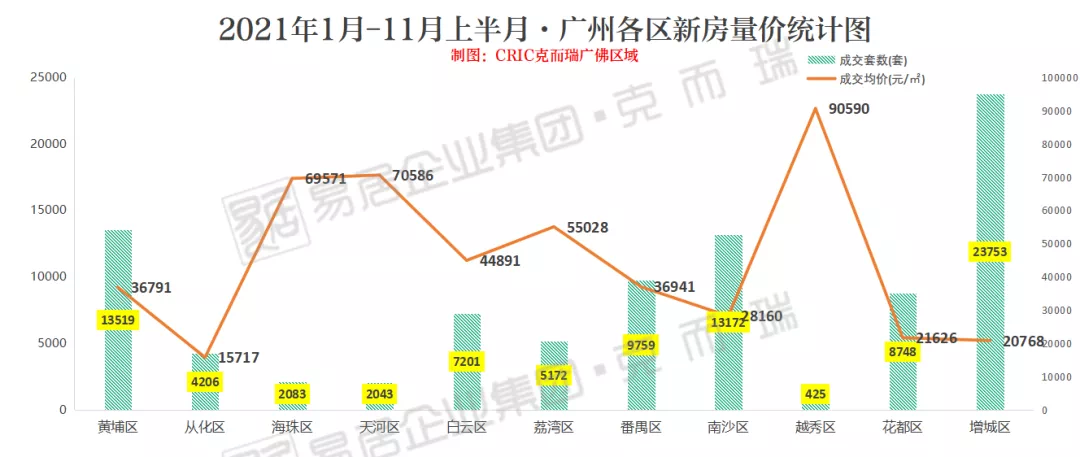 来访认购遇冷,但由于今年楼市是高开低走的,所以从成交总量看,广州新房市场数据尚可。截至11月上半月,今年广州各区新房量价情况(口径:普通住宅+别墅):仅排名前三的区域完成超一万套的网签量,分别是增城区以23753套一马当先,远远甩开其余十区;排名第二的是黄埔区,网签成交13519套,南沙区网签成交13172套排名第三。倒数排名前列的则是位于中心的越秀区,仅网签成交425套,少有低于千套体量的区域;当然,这与该区新房极少的供应量拉不开关系。