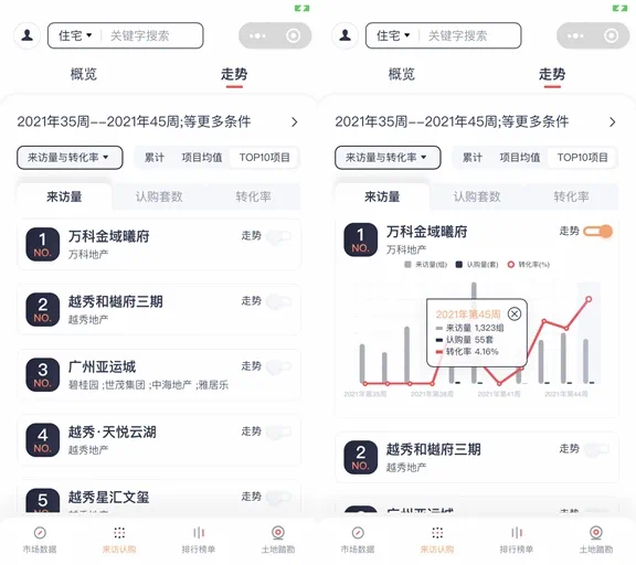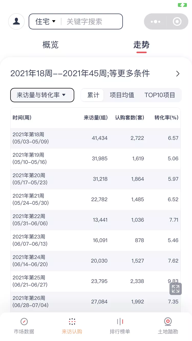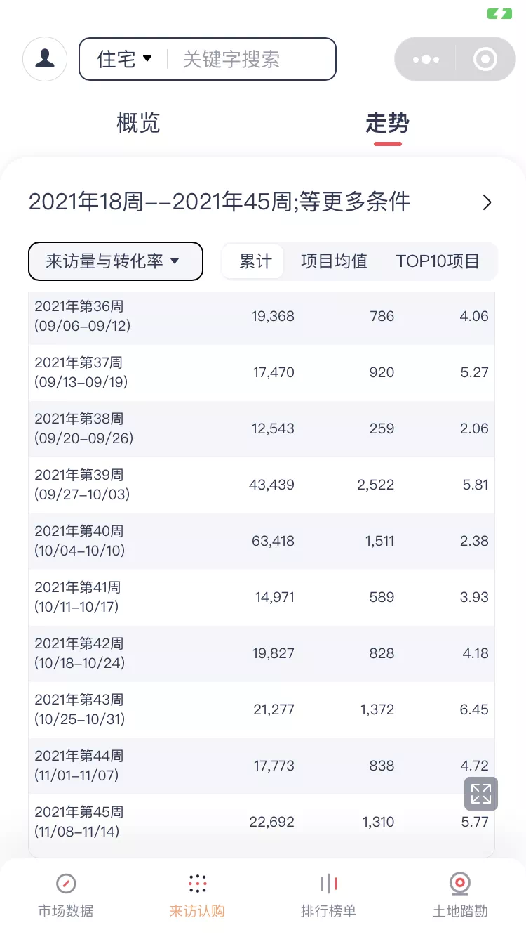 从趋势图看,全市的新房来访/认购转化率也从之前的6%至7%之间,已降低至4%上下;说明了,购房者的买房置业需求依旧存在,但由于市场规则变化,观望情绪骤增,交易意向走低。甚至,即便是来访量TOP、或转化率TOP项目,也遭受了不少波动;将数据范畴定在9月-11月中的周度数据,如图所示,排名来访量TOP10的冠军项目万科金域曦府,在首开后来访量向好,然后其较新成绩第45周,来访量1323组,当周仅认购55套,转化率仅有4.16%;