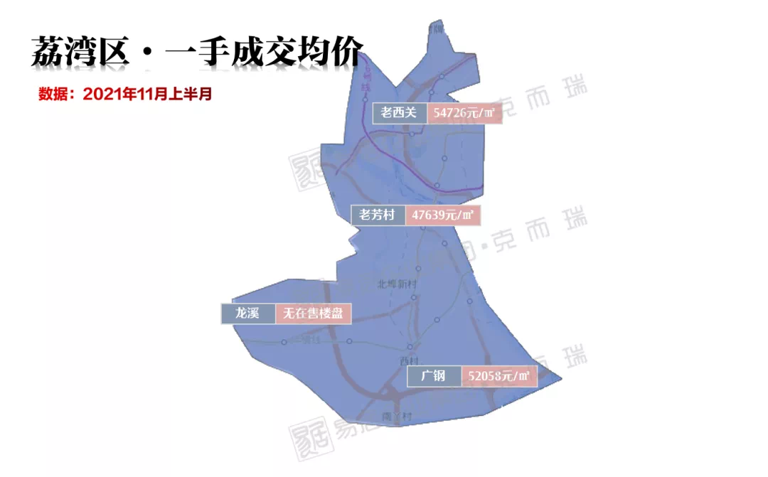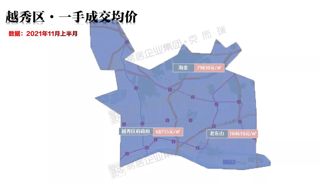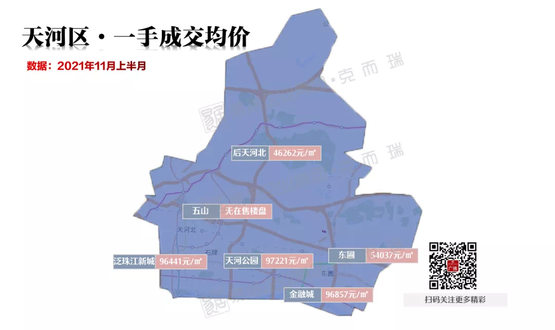 克而瑞数据显示,在2021年1月-11月上半月,广州各区新房成交均价“分水岭”明显,其中中心五区的均价在4字头以上,除从化区尚在1字头,其余区域均在2至3字头范围。其中,越秀区以9万元/平的成交均价站在全市较高位,其次天河区7万元/平,海珠区6.9万元/平。
