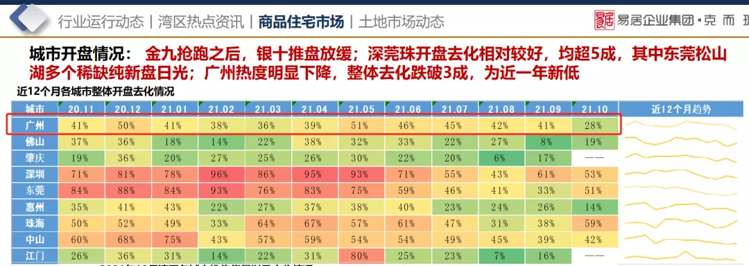 进入2021年以来,广州楼市的“规则”变幻莫测,从年初的新房涨价挑客,到5月限价落地使开发商捂盘惜售,再到如今多盘降价优惠、各渠道联动狂销......在如此混杂的情形下,广州新房市场能否有购房者“给面子”?克而瑞数据显示,刚过去的金九银十新房交易十分寡淡!对比近六年,即2016-2021年的金九银十两月表现:2021年金九银十一新房成交面积为145.91万㎡,在六年内的成交量中排名倒数第三。不仅如此,从CRIC湾区监测10月报告获知,在完整月10月中广州热度明显下降,整体去化跌破3成,仅有28%,为近一年新低,购房者观望情绪骤增!