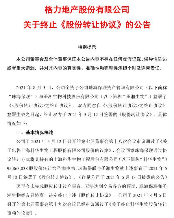 日前,格力地产公告称,因至今未完成股权转让过户事宜,无法达到交易各方的预期,格力地产筹备了近3个月的19.5亿转让科华生物股份事项被迫终止。