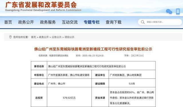 根据《公示》,佛穗莞城际鹭洲至新塘段的总投资为579.52亿元,建设期限为5.5年。资本金占总投资的50%,由广州、佛山两市承担。资本金以外的资金,则通过银行贷款等多元化渠道解决。