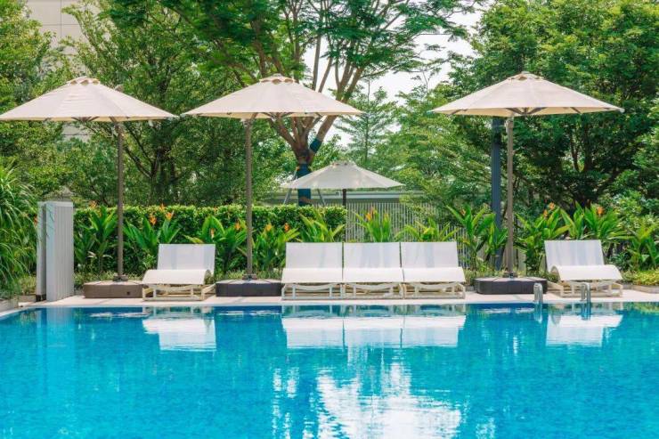 同时泳池针对不同年龄段配置深水区、浅水区,周边种植了热带棕榈科植物,还设置了休闲休憩区,在家门口就能享受到度假的乐趣。