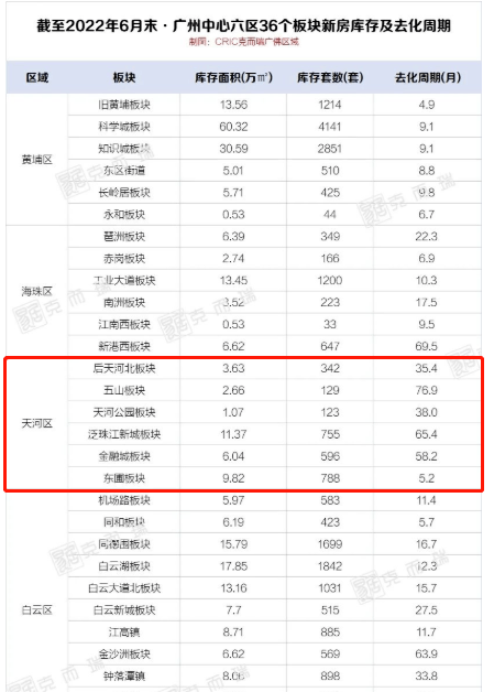 新房方面,据克而瑞数据显示,截至6月末,天河去化周期为14.9个月,高于行业警戒线(12个月),分到具体版块、五山版块、泛珠江新城版块、金融城板块去化周期长,较高的达76.9个月。