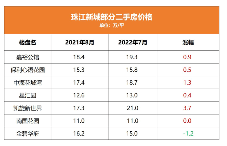 据链家贝壳等平台信息显示,“宇宙中心”珠江新城版块的几个标杆盘二手价还是以涨为主,近一年时间如嘉裕公馆、保利心语花园、中海花地湾涨幅5-10k/平,凯旋新世界去年8月均价约17w/平,今年7月均价更是突破20w/平,涨幅惊人!
