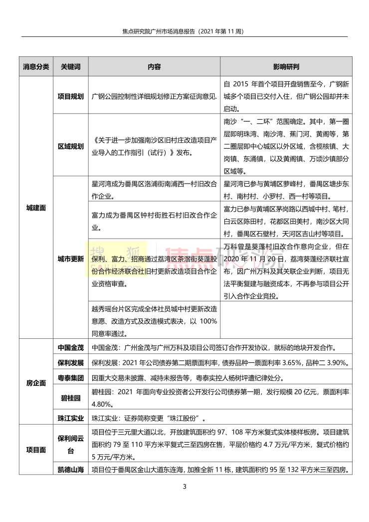 城建方面,广钢公园控制性详细规划修正方案征询意见;南沙发布《关于进一步加强南沙区旧村庄改造项目产业导入的工作指引(试行)》,并确定南沙“一、二环”范围。城市更新方面,星河湾、富力成为番禺区西一村、胜石村更新改造合作企业,保利、富力、招商通过荔湾区茶滘街葵蓬股份合作经济联合社旧村更新改造项目合作企业资格审查,越秀瑶台片区改造意愿表决以100%通过。