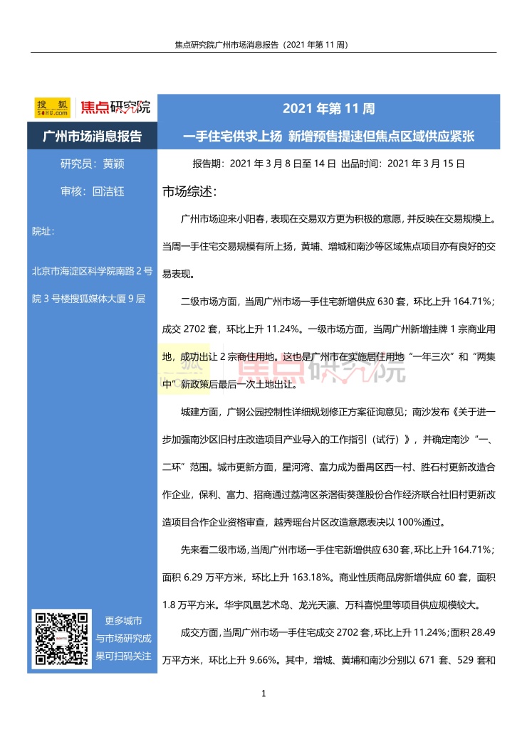 二级市场方面,当周广州市场一手住宅新增供应630套,环比上升164.71%;成交2702套,环比上升11.24%。一级市场方面,当周广州新增挂牌1宗商业用地,成功出让2宗商住用地。这也是广州市在实施居住用地“一年三次”和“两集中”新政策后最后一次土地出让。