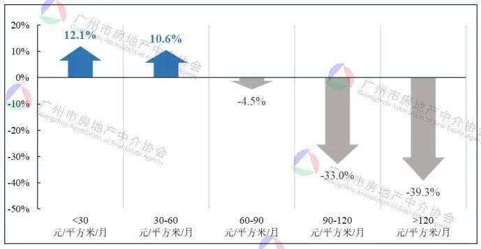 2025年,60元/平方米·月及以下的物业,成交规模同比呈正增长,增幅均在10个百分点以上;而90元至120元/平方米·月及超120元/平方米·月的高端租赁物业成交规模降幅分别达到33%、39.3%。