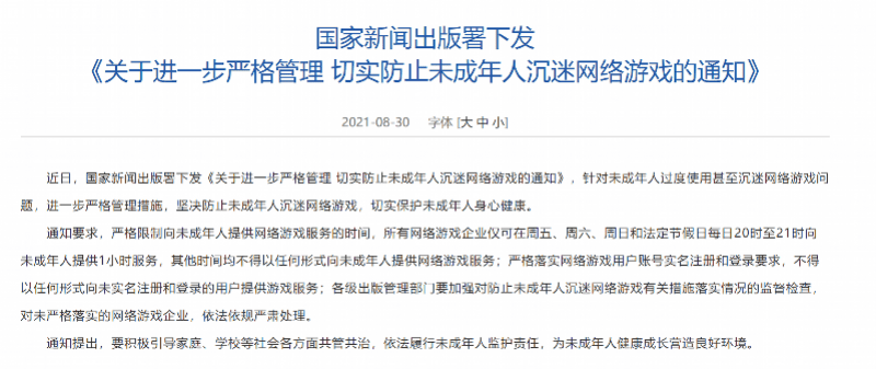 8月30日,国家新闻出版署下发《关于进一步严格管理 切实防止未成年人沉迷网络游戏的通知》(下称《通知》),提出四项举措。其中要求网络游戏企业仅可在周末和节假日向未成年人提供一小时服务。