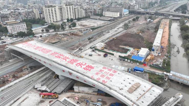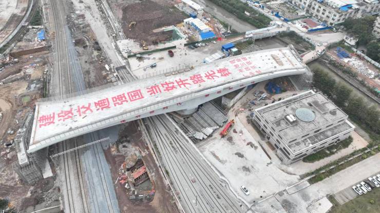 近日,在两台连续张拉千斤顶对称匀速拉动牵引下,由广州地铁集团负责建设管理,中铁三局承建的广州白云站综合交通枢纽一体化建设工程(以下简称“广州白云站”)配套市政道路项目铁路东线SF、SG匝道非对称曲线转体桥跨越京广铁路,经过85分钟后成功“华丽转身”,标志着该项目重要施工节点顺利完成。