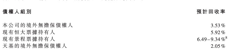 根据初步分析,在恒大集团层面的清算中对中国恒大的境外无担保债权人的预估回收预计约97.28亿元,不同组别债权人的预估回收率如下: