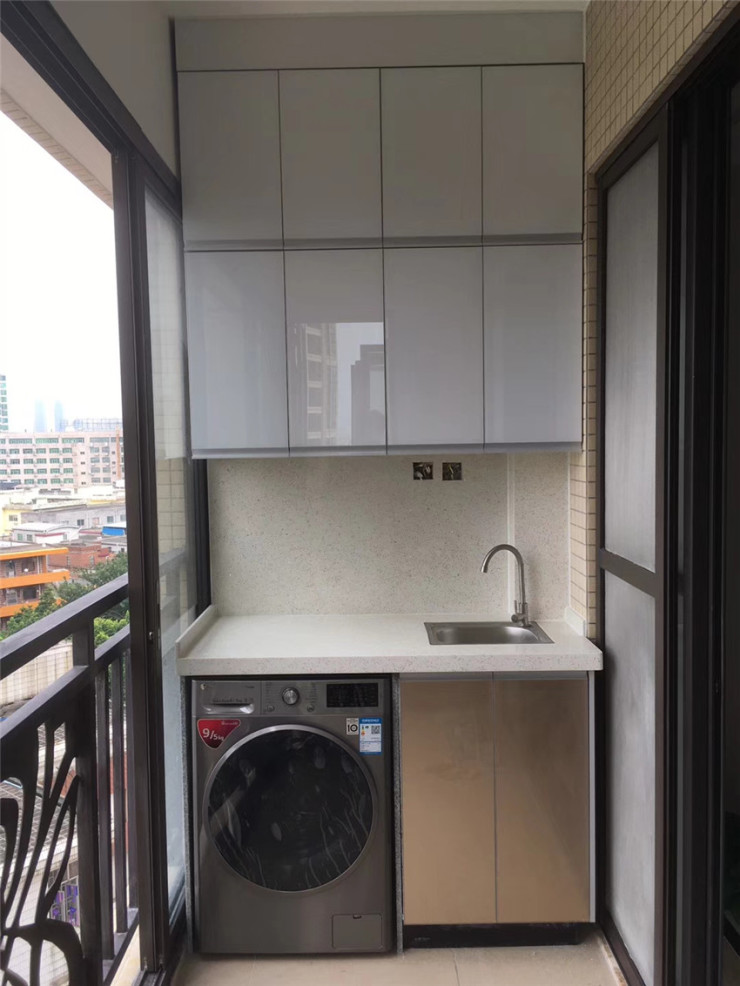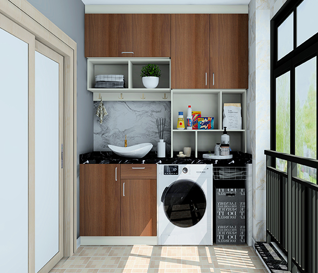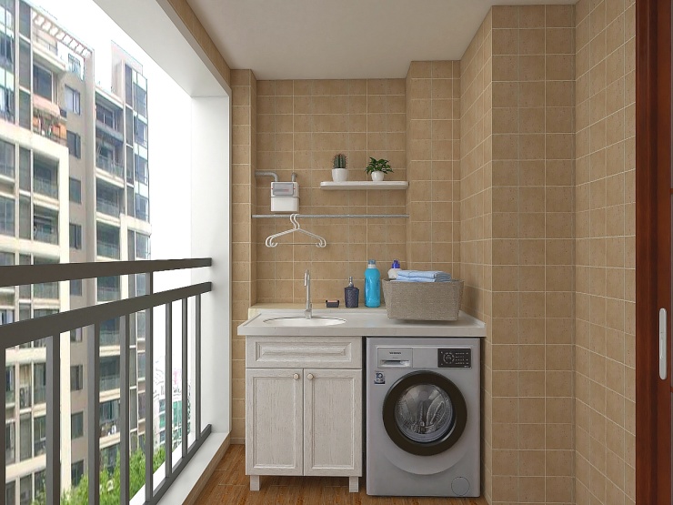 有阳台的家庭,只要阳台不是连洗衣机都放不下哪种,都不会把洗衣机放在浴室,在这洗衣晒衣更便利,定制阳台柜就行。如果底下放了洗衣机就没空间哪种阳台,就做吊柜+隔板放小型的清洗用具,还能放盆栽。