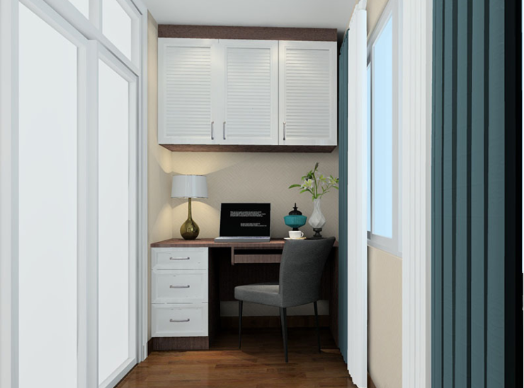 阳台较长或者家里有双阳台,可以拿出一个做休闲区或者办公区。如果阳台较长,那么可以利用另外一端设计储物柜,还可以做些架子养绿植等,具体看个人需求。