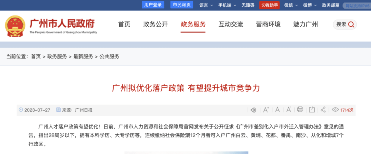 7月27日,广州市人力资源和社会保障局发布了一份关于公开征求《广州市差别化入户市外迁入管理办法》意见的通告。通告指出28周岁以下,大专学历等,连缴社保满一年者可入户广州白云、黄埔、花都、番禺、南沙、从化和增城7个行政区。