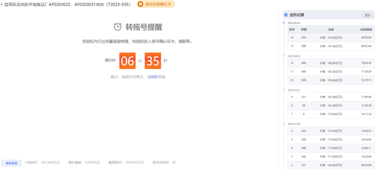 今日(4月3日),荔湾区花地街羊城食品厂AF0203022、AF0203031地块竞价出让,引来多家房企争抢,最终一开拍便转入摇号环节。
