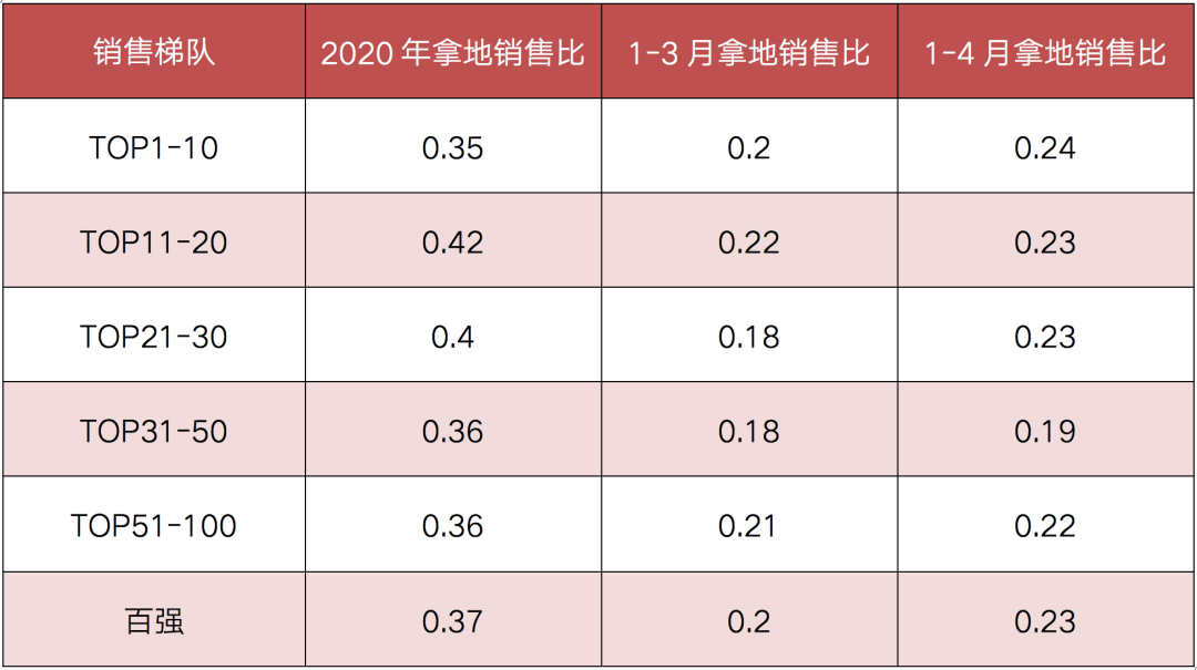 从2021年1-4月百强房企拿地销售比为0.23,较三月末小幅提升0.03。这主要是由于,在5个城市首次集中供地的带动下,房企投资积极性有所提升,但由于部分核心城市集中供地尚未开始,导致部分区域深耕的房企本月尚无新增土储。分梯队来看,TOP1-10、TOP21-30房企积极性提升最为显著,截止4月末拿地销售比分别为0.24和0.23,较3月末分别提升0.04和0.05。在招商、金地等10强房企积极参与土地集中出让、并有所斩获的情况下,10强房企成为拿地销售比较高的梯队。