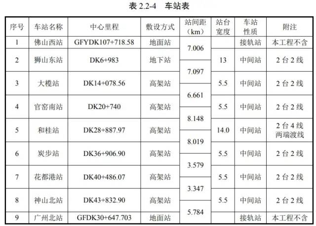 其中7座车站为新建,分别为狮山东站、大榄站、官窑南站、和桂站、炭步站、花都港站、神山北站。7座车站中,除狮山东站为地下中间站,其余6座车站为高架中间站。