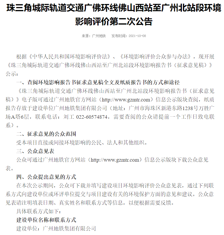 日前,广州地铁集团有限公司公示了《珠三角城际轨道交通广佛环线佛山西站至广州北站段环境影响报告书(征求意见稿)》,公告显示,该工程计划年内开工建设,总工期60个月。