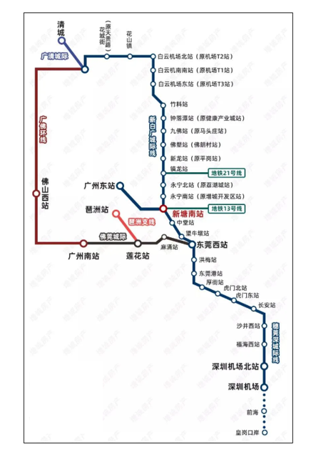 其中,新白广城际在增城区境内线路13.2公里,设永宁北站(原荔湖城)、永宁南站(原增城经济技术开发区)、新塘站三个站点。