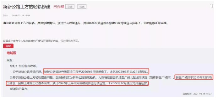 此前有市民咨询关于新白广城际的问题,据官方8月16日的回复称,新白广城际于2015年12月动工建设,目前土建施工已基本完成,预计2022年上半年完成建设并进行试运营,于2022年12月底正式开通运营。