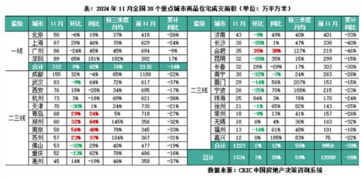 另据克而瑞统计数据,11月得益于政策稳信心强预期叠加新增供应大幅回升,30个重点城市新增供应930万平方米,环比上升35%;成交面积达1534万平方米,环比微增3%,同比增长20%,与三季度月均值相比增长59%,前11月累计同比降幅收窄至26%。