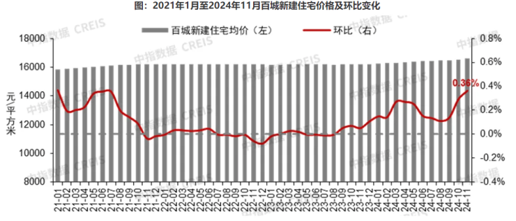 百城新建住宅价格指数显示,11月百城新建住宅平均价格为16592元/平方米,价格环比结构性上涨0.36%,同比上涨2.40%,环比增幅为近三年的最高水平。其中,一线和二线城市新房价格环比分别上涨0.69%和0.33%,宁波、上海和成都环比涨幅均超过1%,分别达到1.34%、1.32%和1.28%。