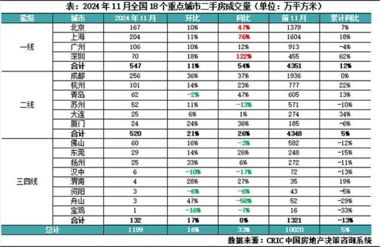 另据克而瑞数据,11月18个重点城市二手房成交面积预计为1199万平方米,环比增长16%,同比增长33%。前11月,18个重点城市二手房累计成交面积预计为10020万平方米,累计同比增长5%。