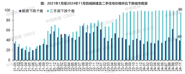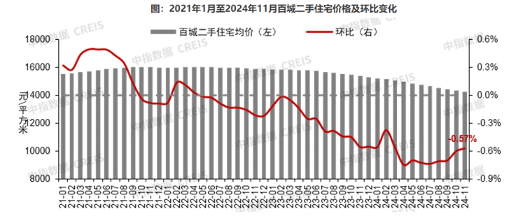 据中国房地产指数系统百城价格指数,受优质改善项目入市带动,11月全国100个城市(以下简称百城)新建住宅平均价格为16592元/平方米,环比结构性上涨0.36%,同比上涨2.40%;二手住宅方面,以价换量趋势延续,百城二手住宅平均价格为14278元/平方米,环比下跌0.57%,跌幅较10月收窄0.03个百分点,同比下跌7.29%。