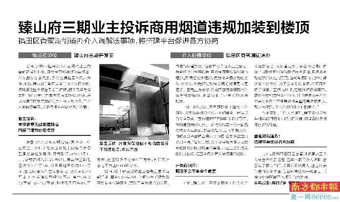 此前,南都记者报道了有关深圳市福田臻山府三期业主反馈开发商违规加装商用烟道一事。近日,深圳市名爵房地产开发有限公司告诉南都记者,在辖区街道办、综治办等主持和协调后,将立即启动拆除高空烟道相关工作,并根据规划报建图纸,恢复低空烟道。对此,业主们表示同意此拆除高空烟道的方案。