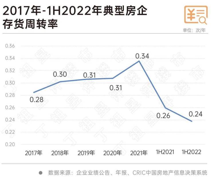 从存货周转率来看,2022年上半年末典型房企的加权平均存货周转率为0.24次/年,同比下降0.02次/年,约有58%的企业存货周转率同比下滑,部分房企存货周转速度较慢,23%企业存货周转率不足0.15次/年。