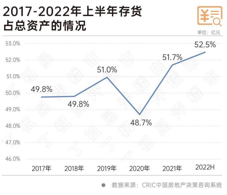 在严控负债的大环境之下,多数企业选择开源节流,加速销售去化和项目结转,甚至直接出售项目或未开发土地来收缩投资力度,导致存货总量持续收缩。然而,存货占总资产比率却在不断上升,尤其是2022年上半年,在存货总量几乎“零增长”的情况下,存货占总资产的比重升高至52.5%,创近五年新高。