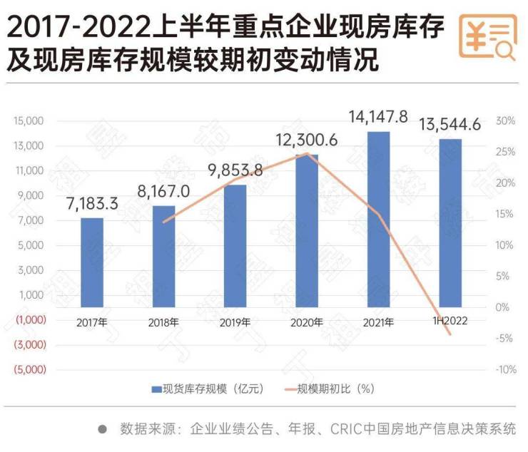 CRIC数据显示,已披露2022年上半年的存货明细的65家重点企业现房库存总量为13544 亿元,现房库存总量较2021年底年小幅下降4.2%,5年来现货库存首次回落。