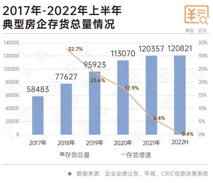 这就导致房企存货总量增速放缓,CRIC数据显示,71家典型房企上半年存货总量达到12.08万亿,较2021年年末仅提升0.4%,而2021年存货增速为6.4%。