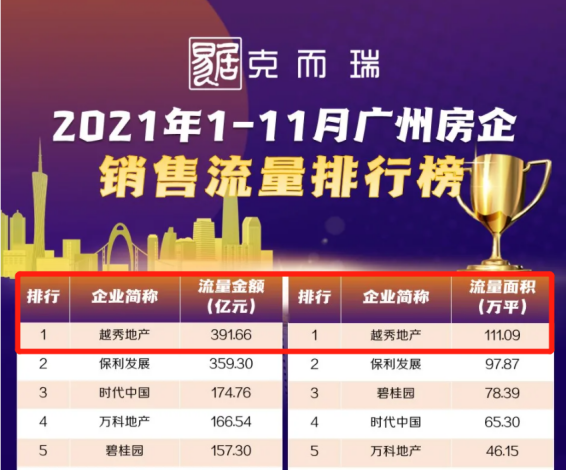 狭路相逢勇者胜!克而瑞数据显示,仅在今年前11个月,老牌国企越秀地产就分别完成了全口径金额461.8亿元、权益金额293.9亿元、流量金额391.6亿元以及流量面积111万平,豪横斩获2021年1-11月广州房企销售四大榜单冠军!
