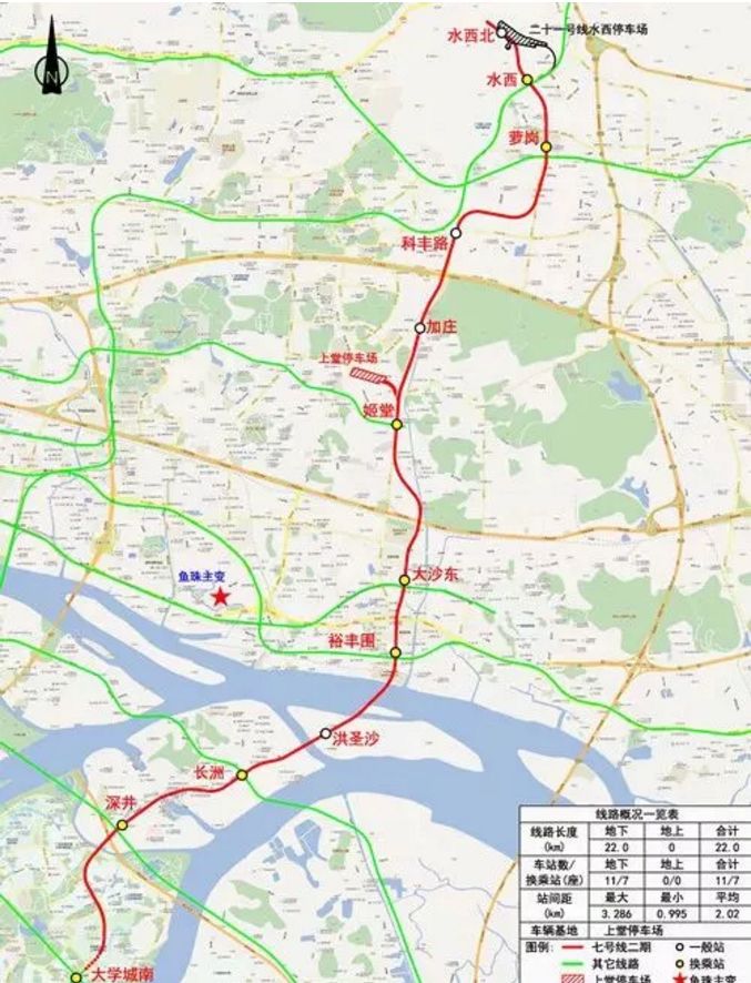 7号线二期,起于已经通车的7号线一期大学城南站,经国际创新城、黄埔临港经济区、奥体新城、广州科学城到达水西北站,途经番禺、黄埔和广州开发区。待线路开通后,届时将满足广州东部片区南北方向的交通需求。