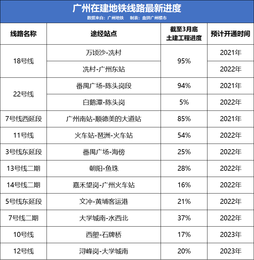 其中,该线路首通段(番禺广场-陈头岗段)预计今年6月投入使用,全线则预计在2022年开通。