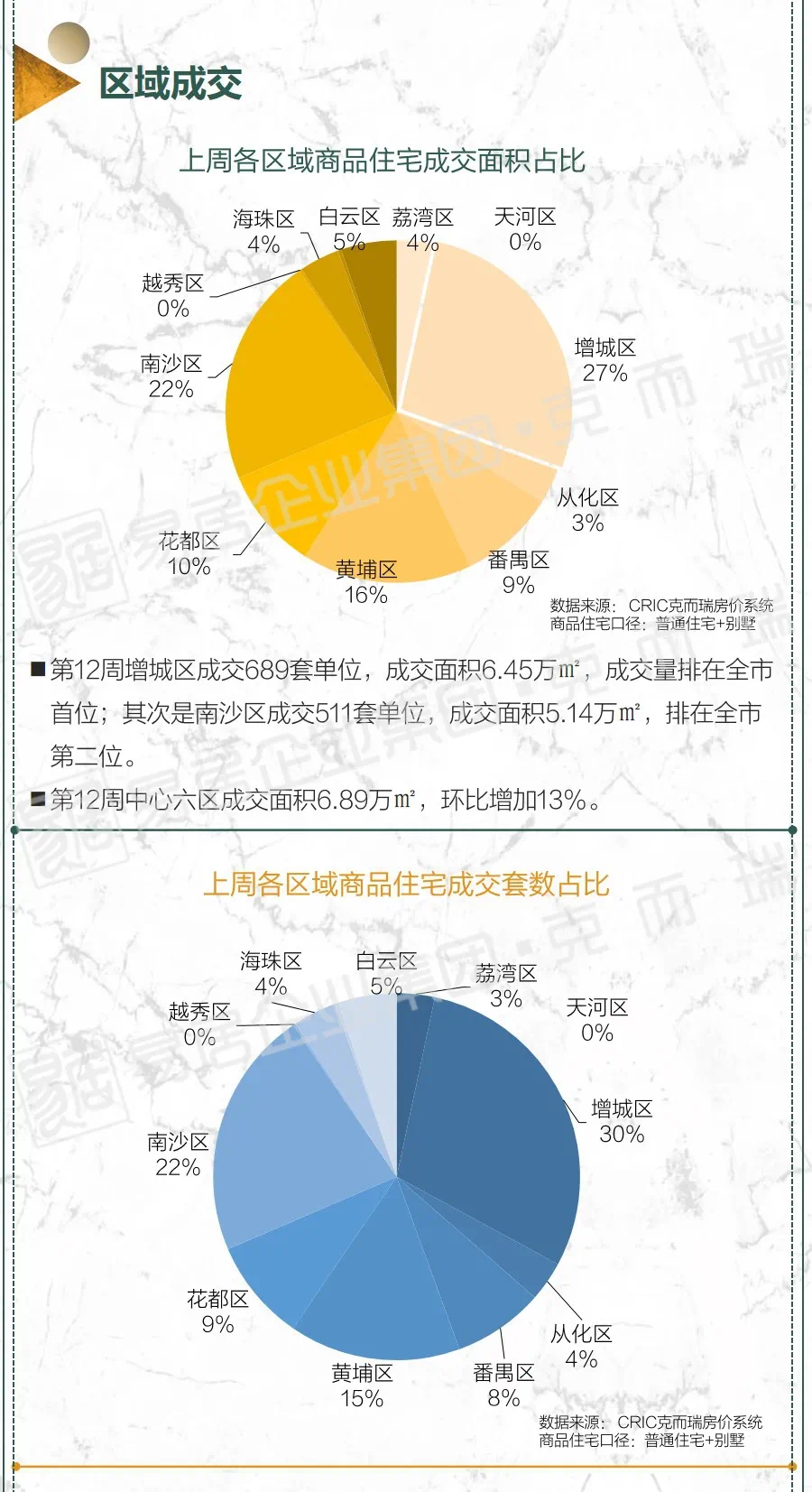 依然是增城区领跑排名前列,成交689套单位,成交面积6.45万㎡,占比27%;其次为黄埔区,成交面积5.14万㎡,占比22%,排在全市第二位。
