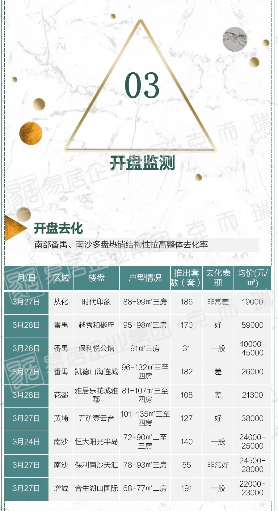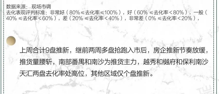 南部番禺和南沙为推货主力,越秀和樾府和保利南沙天汇两盘去化率处高位,其他区域仅个盘推新。