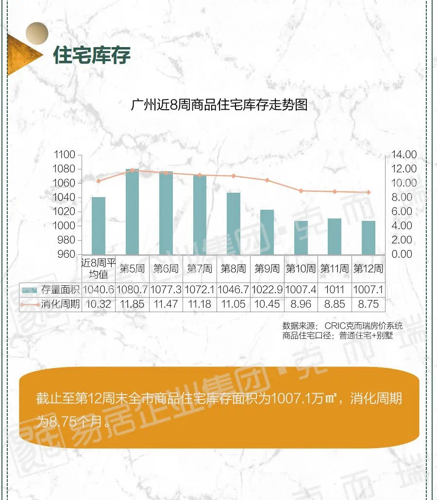 统计到,截止至第12周末全市商品住宅库存面积为1007.1万㎡,消化周期为8.75个月,较之前再刷新低。