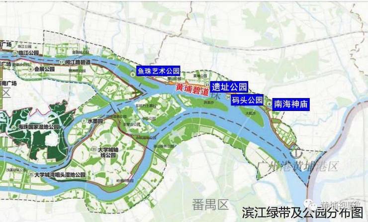 其中黄埔段,规划2个滨水公园:在鱼珠码头规划鱼珠艺术公园,主题为码头风情与文化艺术,在现有南海神庙景区规划主题为历史文化和宗教元素的滨江公园。