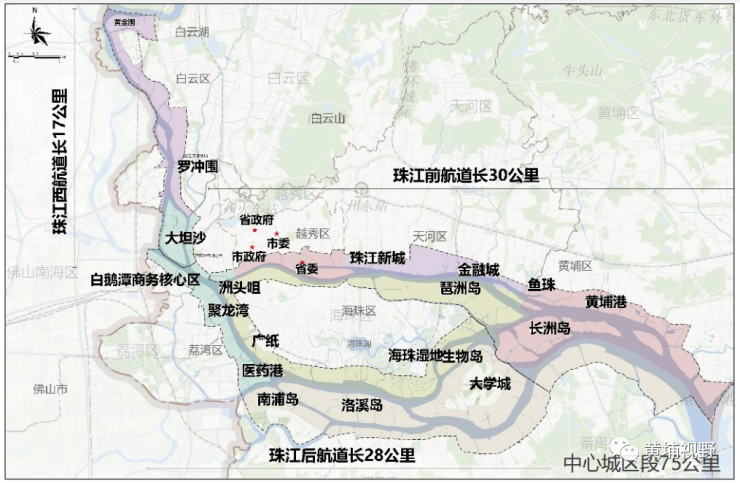 这个区域,就是珠江中心城区段的75公里,西至白鹅潭商务区,东至黄埔临港商务区。包括了珠江较具精华的三十公里段、也是广州东进发展轴。